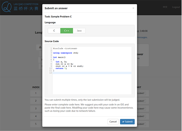 It is suggested that you write your own program in a third party IDE such as Dev-CPP, Code::Blocks or Eclipse. Directly write programs in our system may take risk of losing data when the network connection is not stable.